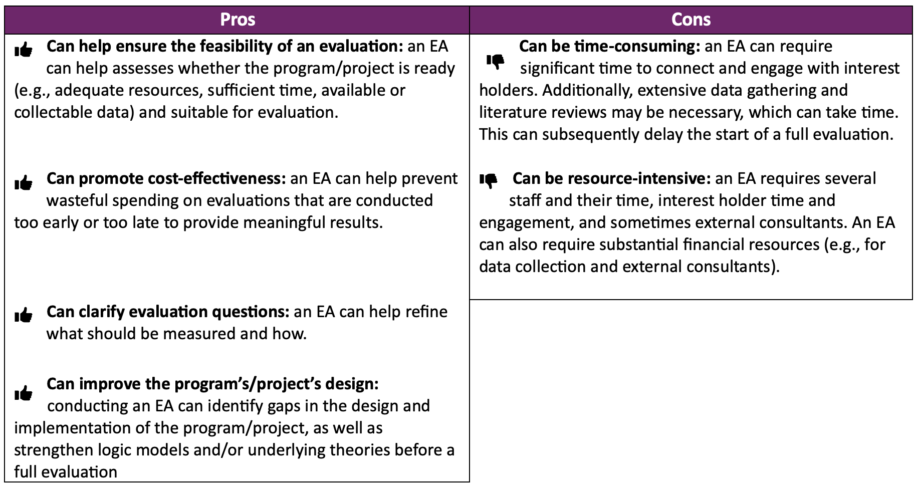 Full evaluations can be lengthy, expensive, and resource-intensive, so they should only be undertaken if the program or project is ready and when the results will be credible, reliable, and used effectively. To increase the likelihood of such an evaluation, EAs can be performed before a full evaluation to determine if the program or project is ready. This involves examining the design, assessing the feasibility of data collection, and considering how the evaluation results will be applied. Essentially, EAs help verify that the program or project is well-defined, that appropriate data is available or that it can be obtained, that the evaluation findings will be useful, and that resources are used well.