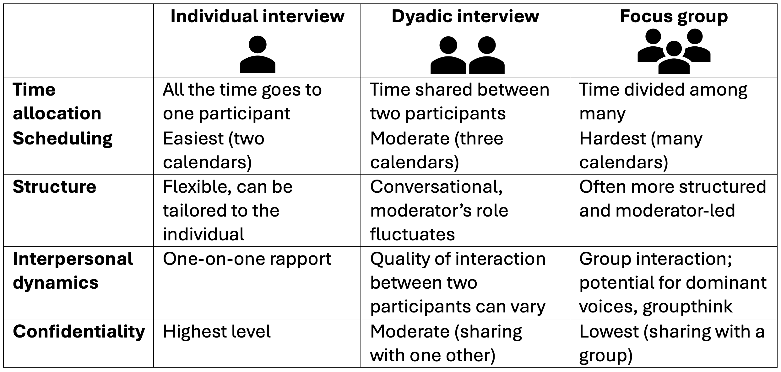 Data depth: Dyadic interviews can yield richer data through shared storytelling, while individual interviews offer different probing opportunities.